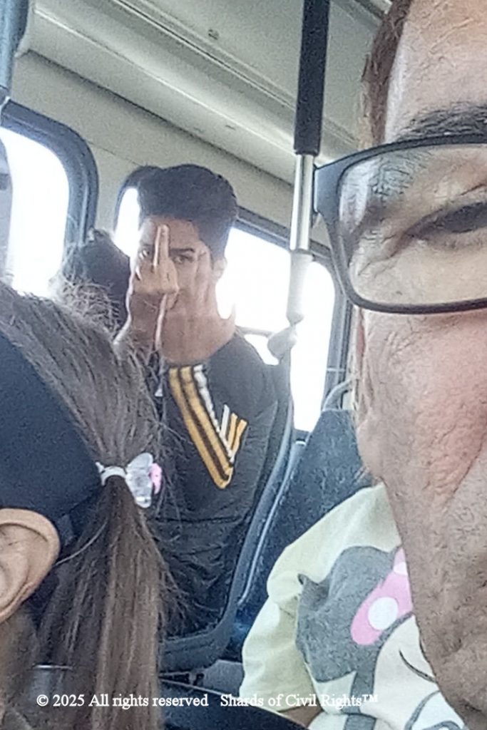 4:00 pm The young couple kept eyeballing us. I snapped a picture of the male, who then threw an apparent gang sign. The female went to the bus driver, told him something that I could not hear, and walked back to her seat. I went up to the driver to inform him that something was going on with the pair; I said I didn’t know what it was, and did not wish to be involved, but just wanted off the bus. The driver said he’d heard her story, and what was mine? I told him again that I did not want to be involved with whatever was going on. I then pulled the cord, requesting to be let off. We were dropped off at the Middle Street merge, the Kalihi stop. I “shaka”ed upon leaving the bus, and the female drew her finger in a “cut-throat” sign across her neck.
